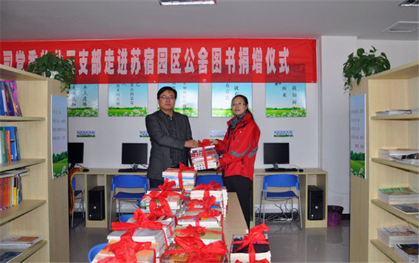 11月17日上午,蘇大教服集團黨委物業三支部陳彤彤書記一行走進園區公舍開展圖書捐贈活動,建發公司副總經理張驥同志參加了此次活動。