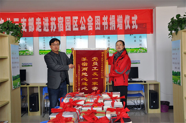 活動現場,陳彤彤代表蘇大教服集團黨委物業三支部捐贈了《紅樓夢》、《中國文學》、《管理學》等書籍20余種310冊和羽毛球拍、乒乓球拍等文體用品;張驥代表建發公司向蘇大教服集團黨委物業三支部贈送了題為“黨員工友一家親,蘇宿兩地心連心”的錦旗,以示感謝。