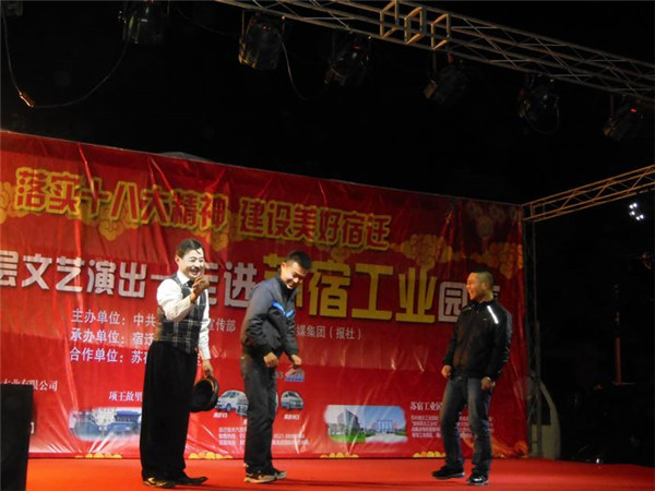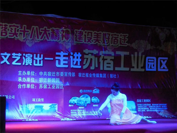 落實十八大精神 建設美好宿遷”服務基層文藝演出由市委宣傳部、宿遷報業傳媒集團(報社)主辦,宿遷新聞網承辦,旨在深入宣傳黨的十八大和市委四屆三次全體(擴大)會議精神,落實文化惠民措施,將走進全市100余個鄉鎮、社區,將包括歌舞、雜技、曲藝、戲劇等內容的百場精彩演出奉獻給廣大基層群眾,此次受園區邀請,專程赴園區公舍演出,為廣大工友及周邊居民帶來了一場精彩的文化大餐。