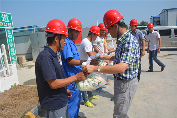 8月14日上午,開發公司副總裁劉建華帶隊來到園區派出所、夢家園、許莊變、2014年市政二標、生產力中心等項目工地,現場慰問奮戰在高溫一線的企業員工和建筑工人,并親自給他們遞上了毛巾、肥皂、洗發水、清涼油等防暑降溫物品。