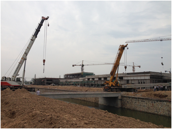近日,在開發公司的積極推進下,可發科技廠區內4座橋梁中的2#橋單跨20m空心梁板正式開始吊裝。