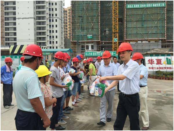 2016年7月27日上午,為切實做好建筑工地防暑降溫工作,讓施工人員在溫馨的工作環境中安全作業,園區黨工委委員、管委會副主任、規劃建設局局長許紹杰、副局長張循在開發公司副總裁劉建華的陪同下冒著酷暑慰問夢家園工地一線施工人員。
