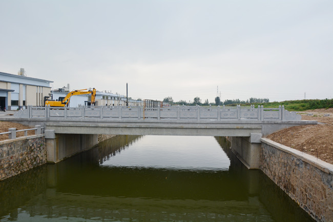可達科技廠內跨民便河設置4座單跨20米簡支梁橋,其中2座12米寬,2座8米寬,設計使用年限為50年,工程造價501萬元。橋梁下部采用重力式橋臺,灌注樁基礎,上部采用預應力混凝土板梁。