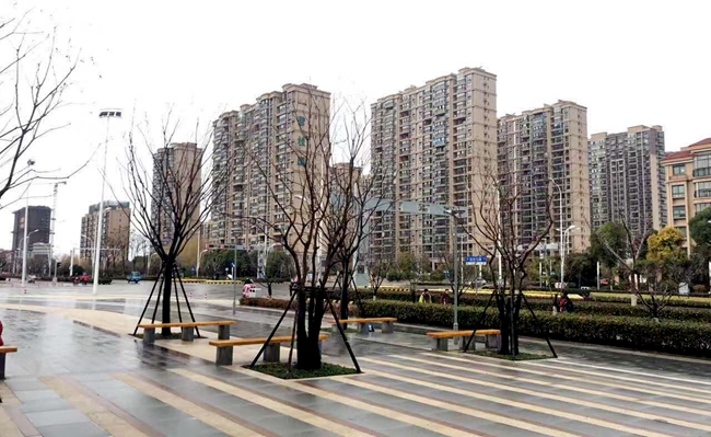 陽澄鄰里中心景觀工程主要包括北側(cè)主廣場(chǎng)石材鋪裝和四個(gè)苗木組團(tuán)共同構(gòu)成,其中綠化組團(tuán)由主廣場(chǎng)樹陣、西側(cè)生態(tài)停車場(chǎng)綠化帶、鄰里中心主入口區(qū)及南側(cè)卸貨區(qū)。苗木主要有櫸樹、烏桕、香樟、樸樹、柿樹等,整體觀感做到四季有賞、落葉常綠分明。