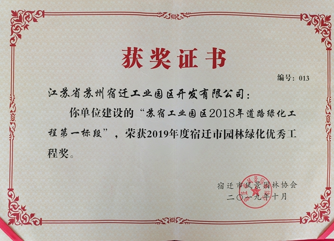 近日,由江蘇省蘇州宿遷工業園區開發有限公司代建的蘇宿工業園區2018年道路綠化工程第一標段被宿遷市風景園林協會評為“2019年度宿遷市園林綠化優秀工程獎”。