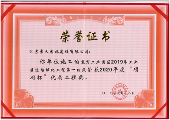 近日,由江蘇省蘇州宿遷工業園區開發有限公司建設管理的蘇宿工業園區2019年工業區道路綠化工程第一標段榮獲2020年度“項羽杯”優質工程獎。