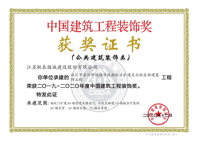 近期,傳來喜訊,由開發公司代建的宿遷市蘇州外國語學校南校區擴建及北校區新建裝飾工程獲得中國建筑裝飾行業最高獎項“中國建筑工程裝飾獎”。
