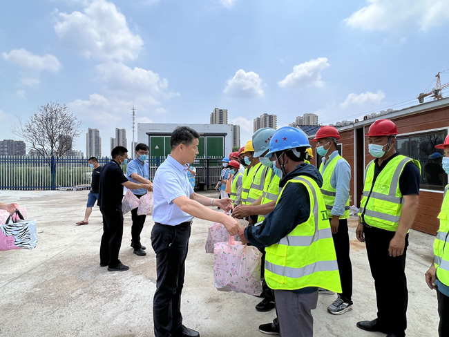 為切實維護高溫期間建筑工人身體健康,保障建筑工人在生產過程中的安全與健康,切實做好安全文明施工,確保工程項目順利推進。7月1日上午,總經理劉建華帶隊慰問建設工程施工現場工人,給他們送去毛巾、香皂、洗發水等防暑降溫用品,感謝他們對園區工程建設作出的貢獻。
