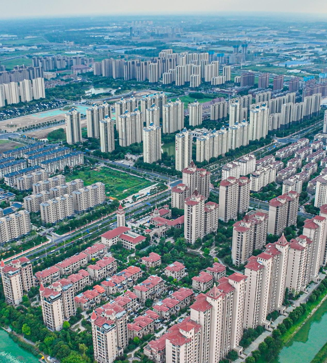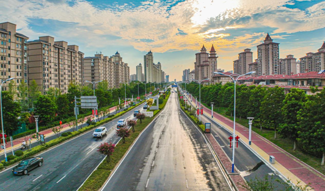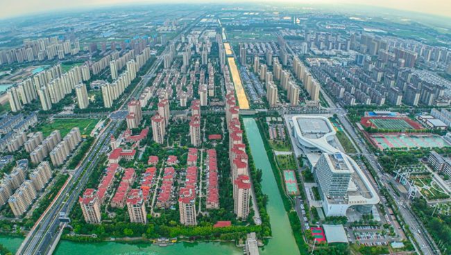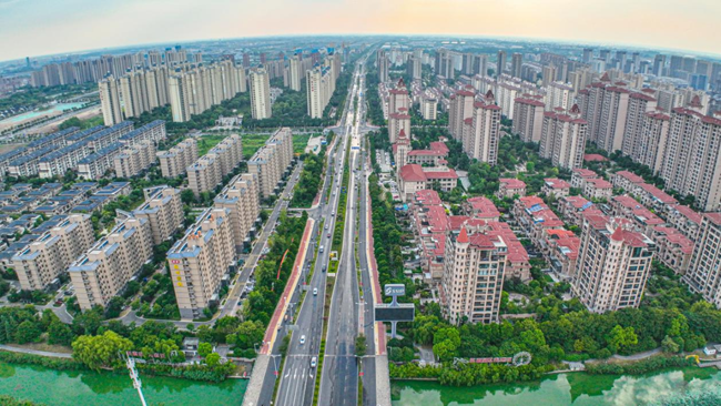 8月11日,航拍蘇宿工業園區商住區,藍天白云晚霞與城市建筑、綠化景觀、交通道路等相互映襯,構成一幅初秋城市美麗生態畫卷。