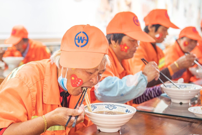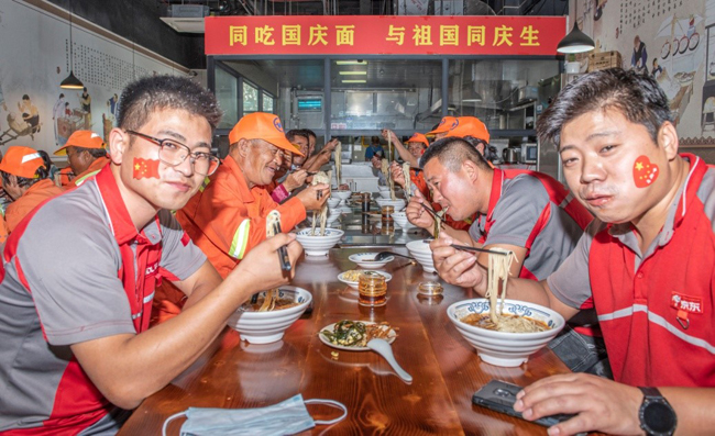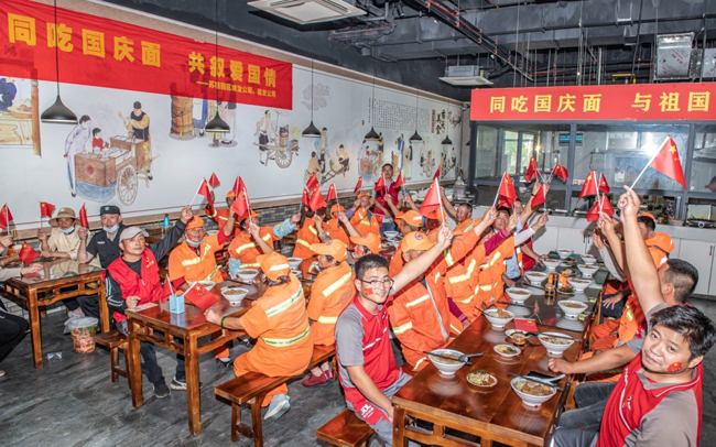 一碗“國慶面”,一份愛國情。當一碗碗熱氣騰騰、香氣撲鼻的面條送到環衛工人、快遞小哥等堅守在一線崗位上的工作人員手中,大家接過面條,享用著寓意美好的“國慶面”,每個人的臉上都洋溢著幸福和快樂的笑容。大家用最樸素最平常的食物,表達了對祖國母親生日快樂的真摯情感。