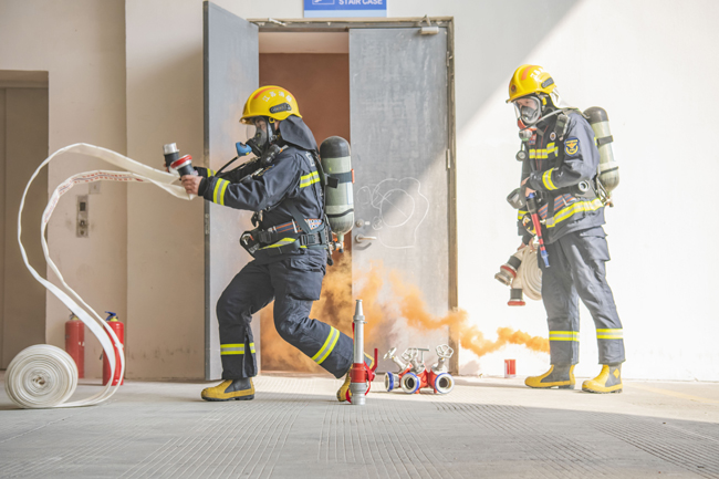 此次演練完全按照“真實模擬火場、現場領受任務、無預案戰斗展開”模式進行,災情假設為B10二層服裝加工企業起火,該企業立即啟動自救預案并撥打消防報警電話。園區消防應急救援大隊接警后,一次性調派2輛消防車11名消防戰斗員趕赴處置,演練過程中按照救人第一的指導思想,科學施救,內攻滅火、內攻搜救、外圍控火、緊急撤離等技戰術措施控制火勢,消滅火災。