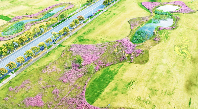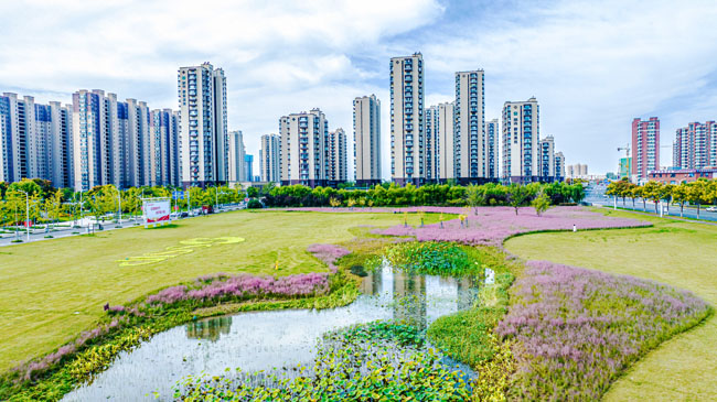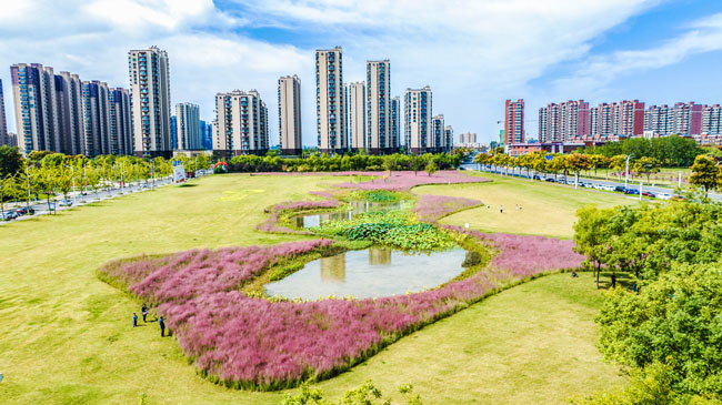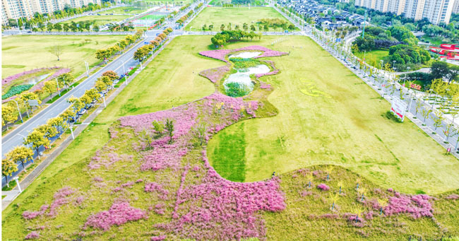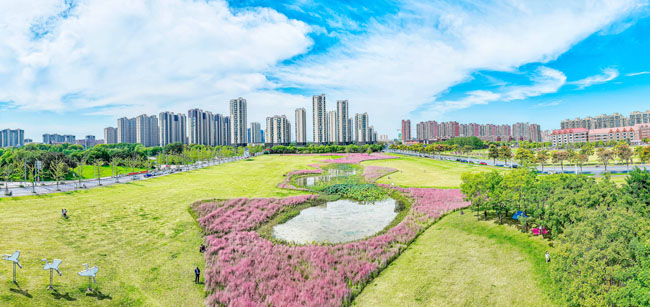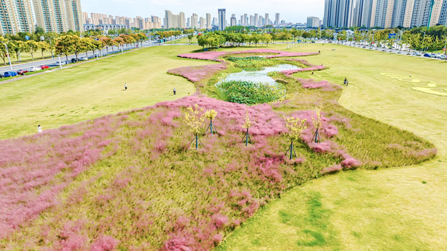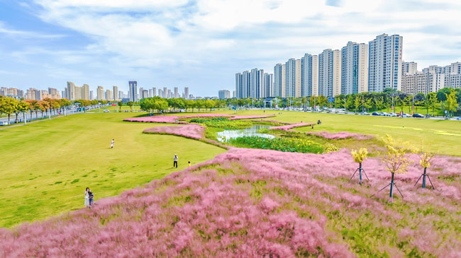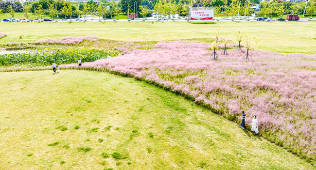 2023年10月1日,蘇宿工業園區蘇州公園北側綠地的粉黛亂子草盛開了,一片片粉色花海如夢似幻,吸引游人前來觀賞,樂享國慶假期。