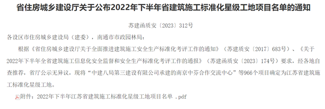 近期,省建設廳下發 《 關于公布2022年下半年江蘇省建筑施工標準化星級工地公示名單 》的通知,城發公司投資建設的青年公寓一期土建及安裝工程喜獲“江蘇省建筑施工標準化星級工地”(二星)稱號。該榮譽的獲得是公司扎實推進省安全生產標準化建設,落實上級關于推進安全生產標準化建設工作部署的要求,建立健全管理機制,積極開展安全文明標準化工地創建所取得的成果,為全省樣板化示范,有效提升建筑施工水平,安全生產發揮了引領作用。