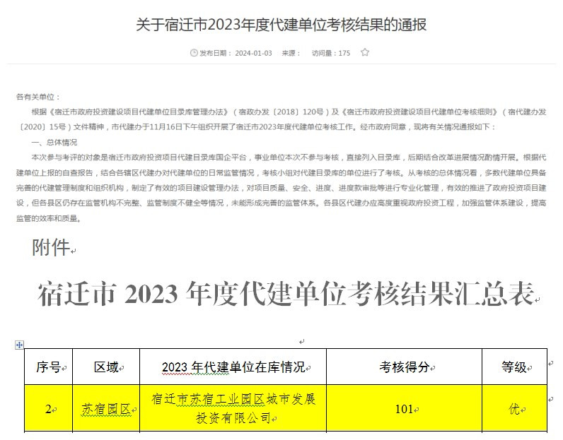 近日,經市政府同意,由宿遷市政府投資建設項目代建管理辦公室通報宿遷市2023年度代建單位考核工作結果,城發公司以101分高分通過本次考核。