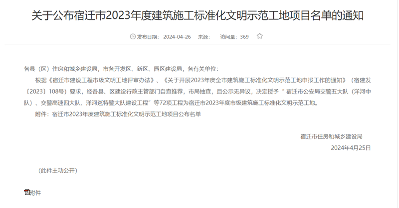 近日,宿遷市2023年度建筑施工標準化文明示范工地項目名單發布,蘇宿工業園區智慧信息產業園項目榮獲2023年度市級建筑施工標準化文明示范工地榮譽稱號。