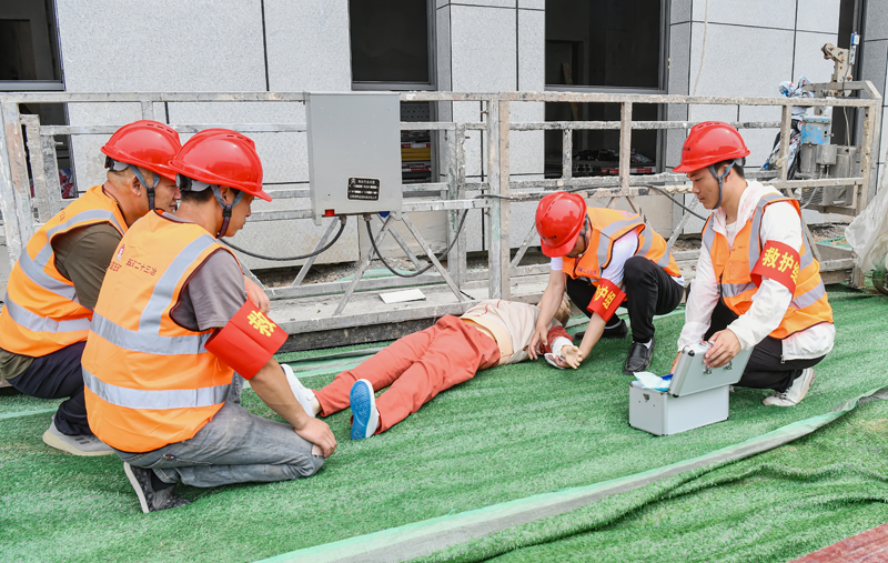 應急演練現場模擬了一名施工人員,在安裝外墻鋁板作業過程中,因違反安全技術交底要求擅自改變作業程序,不慎從高處墜落受傷。安全員發現該情況后,立即上報,隨即應急救援預案迅速啟動,各小組聯合行動,通過科學有序的救援,及時將傷者送醫救治,整個演練過程井然有序。通過演練提高了員工應急自救能力,減少高空墜落事故的發生,并在發生時能及時有效地進行自救和互救。