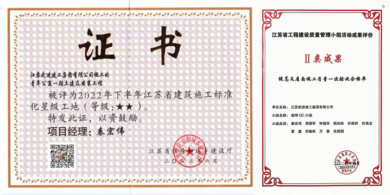 項目在施工中先后獲得了江蘇省建筑施工標(biāo)準(zhǔn)化星級工地、江蘇省綠色施工示范工程、宿遷市工程質(zhì)量管理小組活動II類成果、江蘇省工程建設(shè)質(zhì)量管理小組活動成果評價II類成果等榮譽,同時受到了主管部門、業(yè)界同行的充分肯定。
