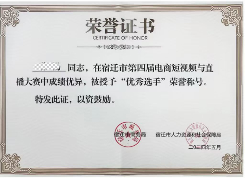 榮譽證書得獲得不僅是對參賽選手個人努力和才華的認可,也是對蘇宿電商園在電商領域專業人才培養和推動電商直播行業發展的成果的肯定。
