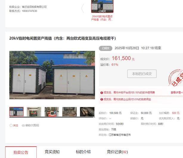 近日,城發公司青年公寓臨時電項目一批閑置資產在中拍平臺公開拍賣,經過27分鐘的緊張激烈競價,最終以161500元成交標的,比評估價100500元高出61000元,溢價率61%。