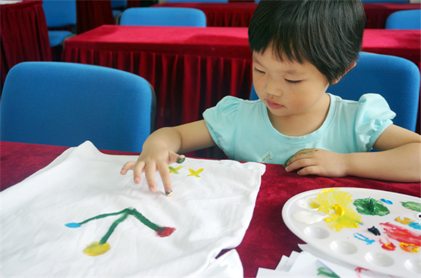 來自園區各居民小區的十余名小朋友參加了開班課程,他們在家長的陪同下,參加了第一期“親子DIY”課程,用自己的小手、畫筆在白凈的T恤上自由發揮,一幅幅“杰作”便在“神筆馬良”筆下誕生。