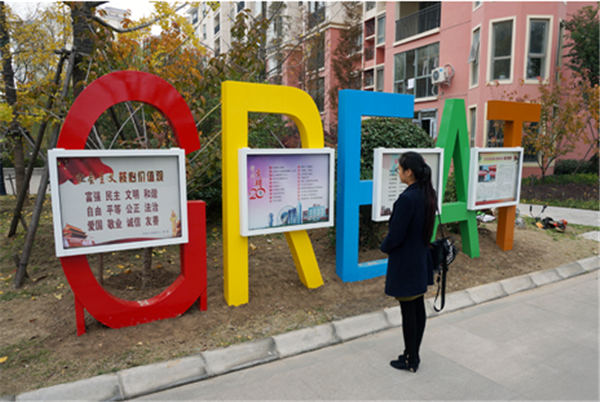 紅黃藍綠橙,多彩的字母組成英文單詞“GREAT”,中間鑲嵌四個方形宣傳框,今年社區在明日星城和恒大綠洲小區試點放置兩個宣傳欄。居民看著社區移走小區大門口的多個移動立牌,放置這樣的宣傳欄紛紛點贊。這次設立“GREAT”立體廣告牌,不僅美化了小區環境,走起了國際范,還有著特殊的意義,“GREAT”具有美好向上的意思,社區希望提倡積極生活、追求美好的社區文化。