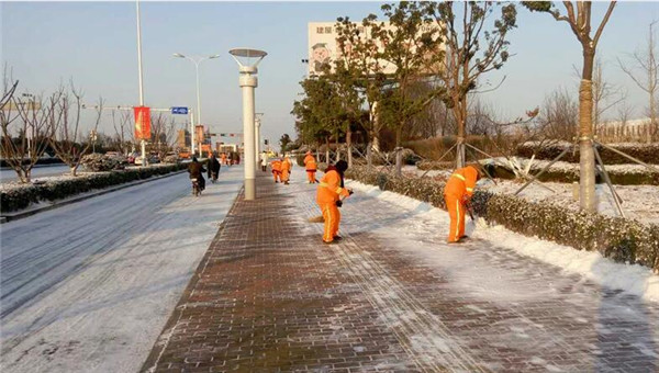 清晨6時(shí),市政部工作人員和環(huán)衛(wèi)工人已經(jīng)開始對轄區(qū)部分主要路段進(jìn)行除雪除冰作業(yè)。在凜冽寒風(fēng)中,他們不畏嚴(yán)寒,經(jīng)過近3 小時(shí)的清掃除冰,截至當(dāng)天上午9時(shí),青海湖西路、通達(dá)大道、紫金山路等主干道及蘇州公園人行道已基本完成路面積雪清掃。
