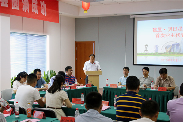 7月31日上午,建屋?明日星城小區首屆業主代表大會在明日民眾聯絡所召開,園區第一家小區業主代表大會成立和業主委員會產生。園區黨工委委員、管委會副主任戈亮出席大會并講話。園區工委管委會辦公室、勞動保障和社會事業局、規劃建設局等職能部門、園區部分住宅小區物業單位代表列席大會觀摩。