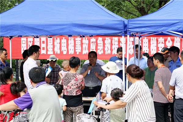 8月6日上午,園區市場監管局、社工委在明日星城小區組織電梯事故應急救援演練暨電梯安全使用宣傳進社區活動。