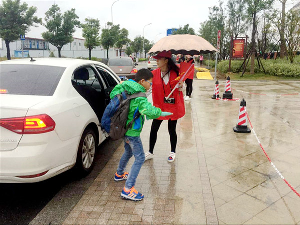 10月21日上午,第一組家長志愿者首次上崗,他們在雨中指揮車輛、疏導(dǎo)交通,用實際行動為孩子們撐起了一把“愛心保護(hù)傘”。
